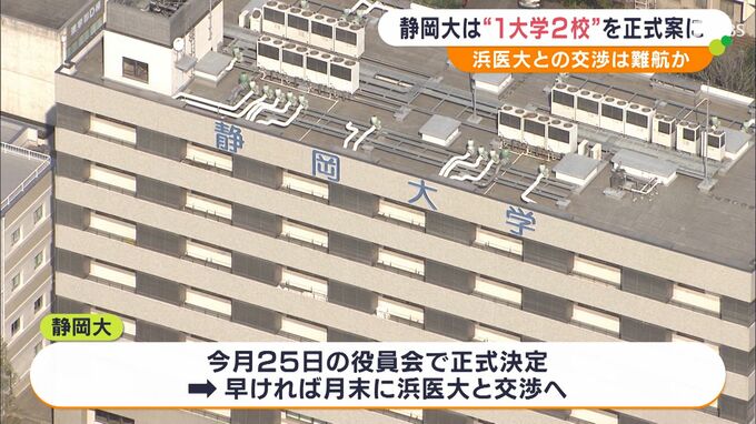 静岡大学は、10月25日の役員会で「1大学2校」案を正式に決定し、早ければ、10月末の協議会で、浜松医科大学とあらためて交渉したい考えです。