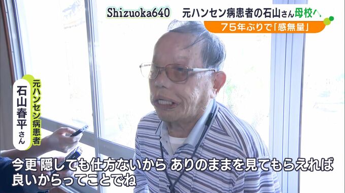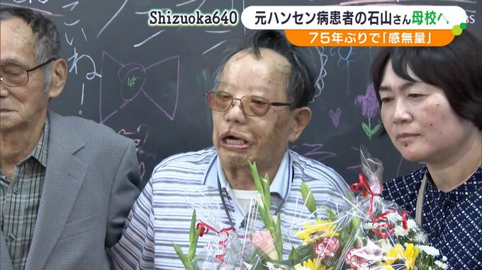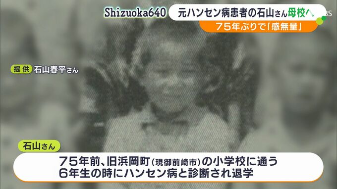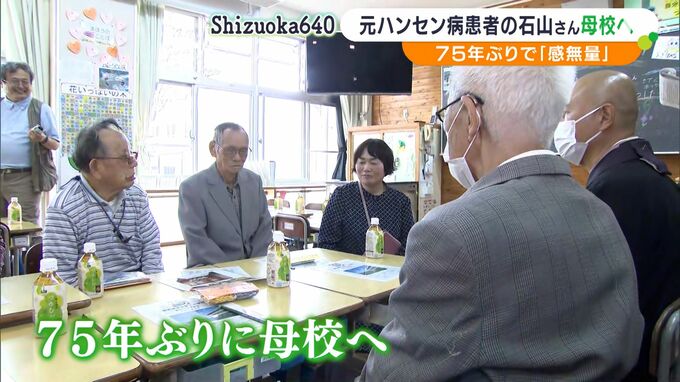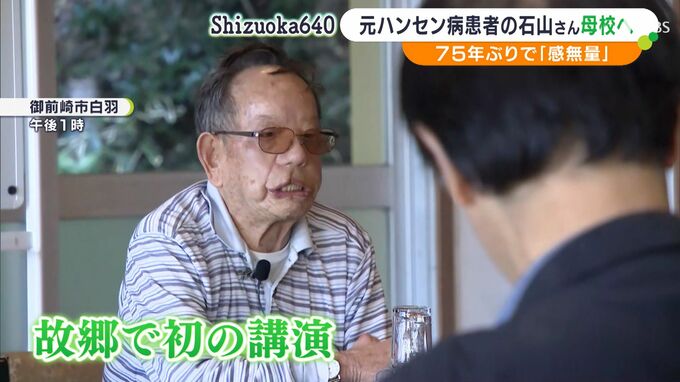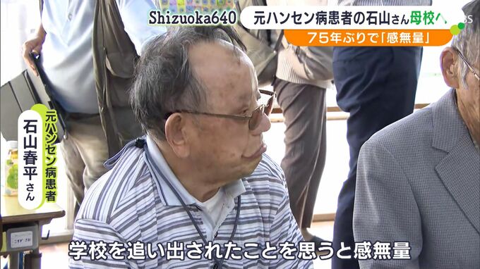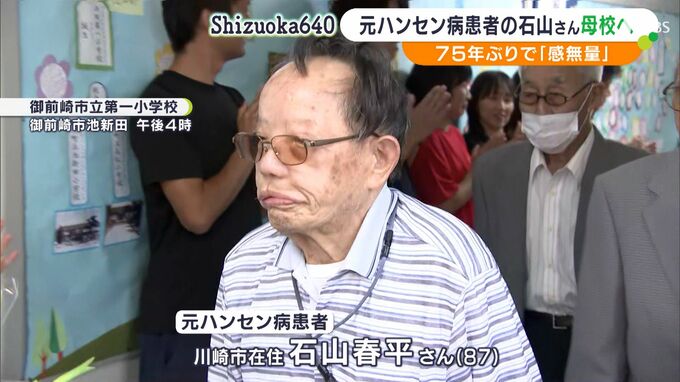 母校の御前崎市立第一小学校で約40人の教員に歓迎されたのは、神奈川県川崎市に住む石山春平さん(87)です。石山さんは75年前、旧浜岡町(現在の御前崎市)の小学校に通っていましたが、6年生の時にハンセン病と診断され、退学。国の誤った政策で強制的に隔離されました。