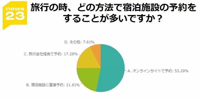 ▽旅行の宿泊時、最もよく使う予約方法を聞いたところ「オンラインサイトで予約」が半数を超え、次いで「宿泊施設に直接予約」が多くなりました。