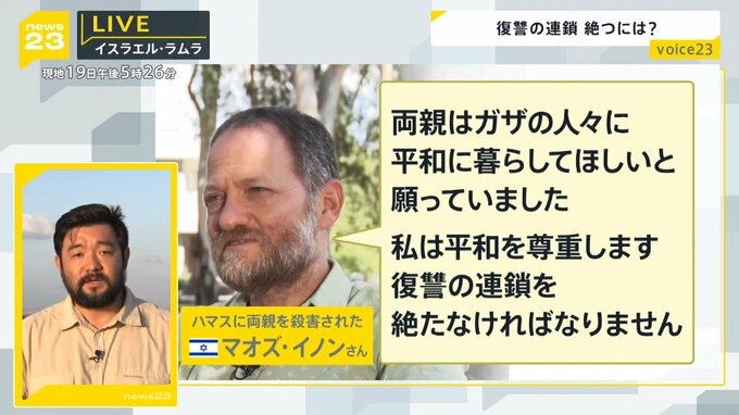 各地で怒りが増幅していく中、“復讐の連鎖”を止めたいと願う男性がいます。イスラエル人のマオズ・イノンさんは、戦闘の発端となったあの日、父・ヤコビさんと母・ビルハさんをハマスの戦闘員に殺害されました。