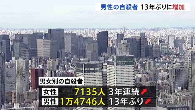 去年1年間に自殺した人の数は2万1881人と、前の年より増加したことがわかりました。男性は13年ぶりに増加に転じています。きょう公表された「自殺対策白書」によりますと、去年1年間に自殺した人は前の年から874人…
