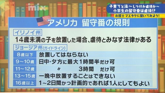 アメリカでの例なんですが、イリノイ州では14歳未満の子を放置した場合、虐待とみなす法律があります。さらには、ジョージア州ではガイドラインの決まりなんですが、すごく細かく決まっています。8歳以下はそもそも放置しちゃ駄目。9歳~10歳は日中夕方なら最大1時間半ぐらいならいいよ、ということが定められています。
