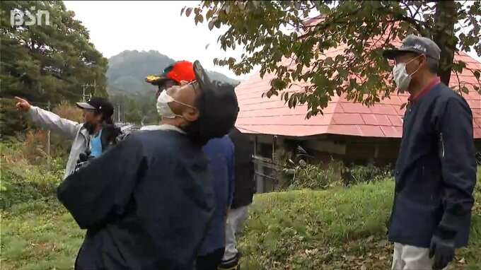 一夜明けた現場では朝から、クマのいた柿の木の実を落とす作業を阿賀町役場の職員が行っています。