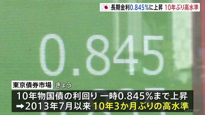 きょうの東京債券市場では日本国債が売られ、長期金利は0.845%まで上昇し、およそ10年3か月ぶりの高水準となりました。きょうの東京債券市場で、長期金利の代表的な指標である10年物国債の利回りは、一時0.845%ま…