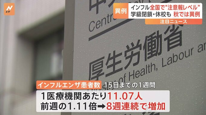 季節性インフルエンザについて、厚生労働省はさきほど、全国で報告された患者の数が1医療機関あたり「11.07人」で8週連続で増加したと発表しました。10月に「注意報レベル」の目安となる10人を全国で超えるのは、1…