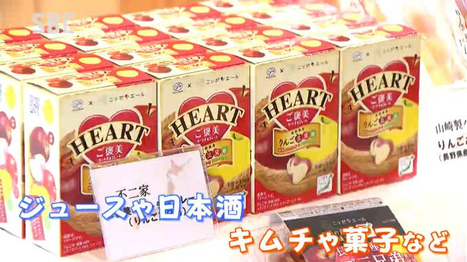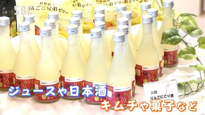 リンゴジュースやリンゴの日本酒、白菜キムチにチョコレートなどの菓子。