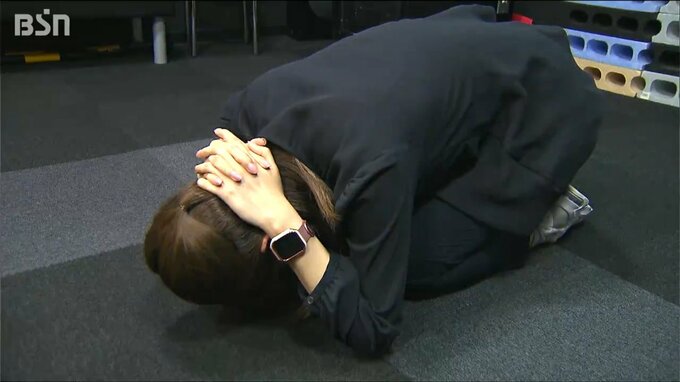 このように手を組んで頭部を保護しながら丸くなり、肘は床につけます。ぜひ覚えておいてください。