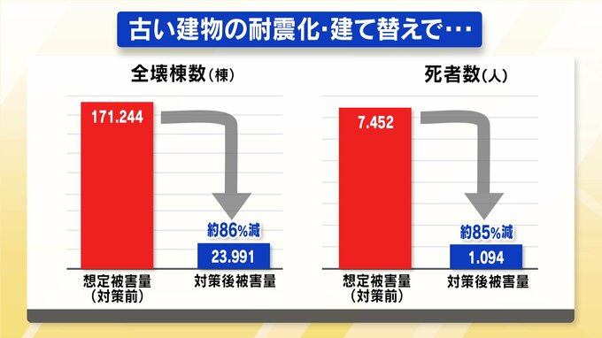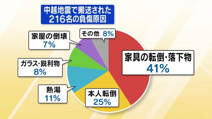中越地震でけがをした216人について原因を調べると、多かったのが倒れた家具や上から落ちてきた物によるけがでした。新潟県によりますと、家の耐震補強や家具の固定をするだけでけがをする人は86%も少なくできるということです。
