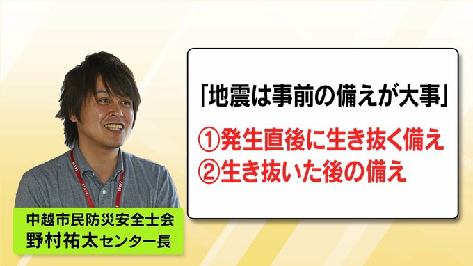 中越市民防災安全士会の野村祐太さんは「地震は事前の備えが大事。特に、発生直後に生き抜く備えと生き抜いた後の備えが必要」と話します。