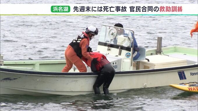 6月19日、浜名湖でボート同士が衝突し、男性1人が死亡した事故がありました。その浜名湖で24日、官民合同の水難救助訓練が実施されました。<訓練の様子>「車両落ちた」「119番に連絡して」「下にボートがあって…