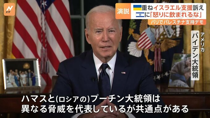 「ハマスと(ロシアの)プーチン大統領は異なる脅威を代表しているが共通点がある。ともに隣国の民主主義を完全に消滅させることを望んでいるのです。ウクライナから手を引き、イスラエルに背を向ければ、すべてが危険にさらされる。そうすることに価値はない」