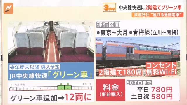 中央線はゲキ混みだから良い。JRだと、常磐線や横須賀線にはグリーン車があるので、中央線になかったのは不思議。