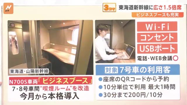 東海道・山陽新幹線では、N700S車両「ビジネスブース」というものができ、10月から本格的に導入されます。