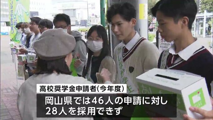 今年度の高校奨学金の申請者は過去最多の2629人で、急増により資金が追いつかず、岡山県でも申請者46人に対し28人が採用できなかったということです。