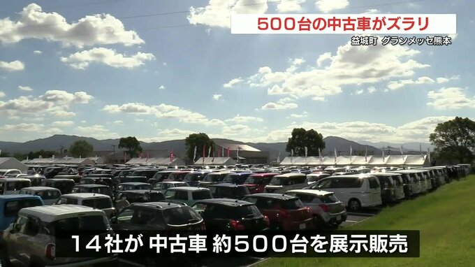 500台の中古車を展示・販売する「中古車フェスティバル」が、22日まで益城町のグランメッセ熊本で開かれています。この「中古車フェスティバル」は、県内の新車ディーラーが年に2回開催しているもので、今回は14社…