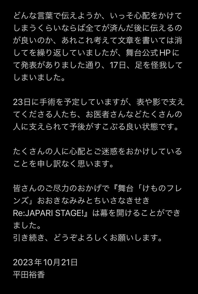 この発表を受けて、平田さんは自身のX(旧ツイッター)で「どんな言葉で伝えようか、 いっそ心配をかけてしまうくらいならば全てが済んだ後に伝えるのが良いのか、あれこれ考えて文章を書いては消してを繰り返していましたが、 舞台公式HPにて発表がありました通り、 17日、 足を怪我してしまいました。」と複雑な胸の内をコメント。