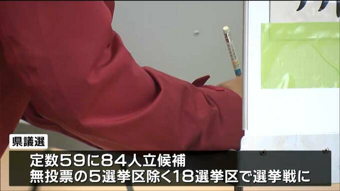 今回の県議選には、定数59に対し84人が立候補し、無投票となった5つの選挙区を除く18の選挙区で選挙戦となりました。