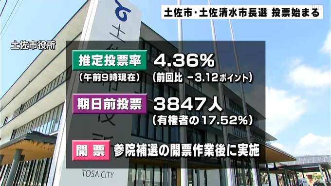 土佐市と土佐清水市では市長選挙の投票も進んでいます。土佐市長選挙は5期目を目指す現職と新人による一騎打ちの選挙戦でした。午前9時現在の推定投票率は4.36%となっていて、16年前の前回を3.12ポイント下回って…