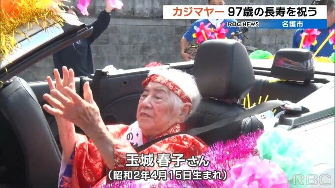 名護市数久田では、この地域出身で昭和2年(1927年)4月15日生まれの玉城春子の97歳を祝うカジマヤーのパレードが盛大に行われました。