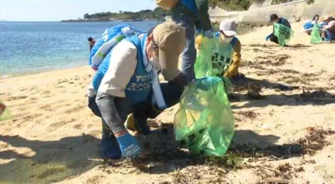 「島の自然を守ろう」と愛媛県松山市の興居島で22日、海岸の清掃活動が行われました。興居島の相子ヶ浜海水浴場で行われたこの清掃活動は、トヨタ自動車の社会貢献活動「TOYOTASOCIALFES」の一…