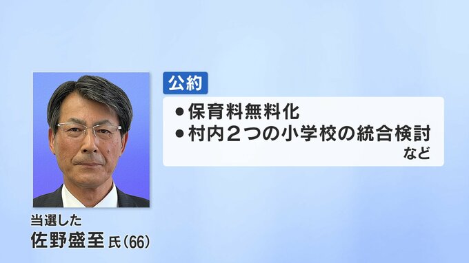 佐野さんは、元村議会副議長で、保育料無料化のほか、教育環境の充実を図るため、村内に2つある小学校の統合検討などを公約に掲げていました。佐野さんの任期は11月9日から4年間です。