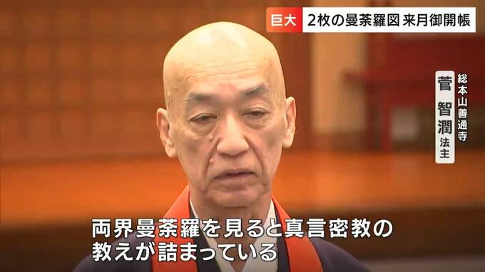 (総本山善通寺 菅智潤法主)「両界曼荼羅を見ると、真言密教の教えが詰まっている。貴重なお大師さまの息吹が感じられる曼荼羅をご覧いただきたい」