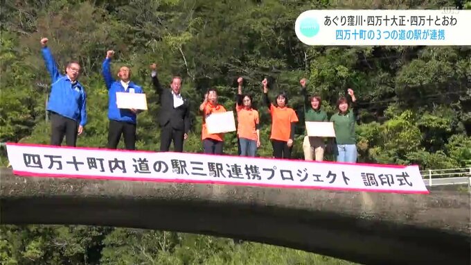 特産品や風景など町の魅力を連携して発信しようと、高知県四万十町の3つの道の駅がスクラムを組みました。四万十川のシンボルでもある“沈下橋”で行われた連携協定の調印式。協定を結んだのは四万十町にある3つの…
