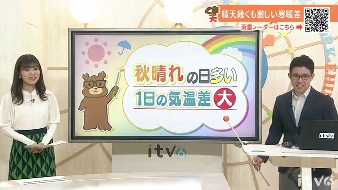 気象予報士の竹之熊和也さんが徹底解説!"くま天"秋晴れの日多い1日の気温差大高気圧に覆われる日が多く、秋晴れの日が続く見込みです。24日(火)の夜や27日(金)ごろに、一部でにわか雨の可能性がありますが、広…