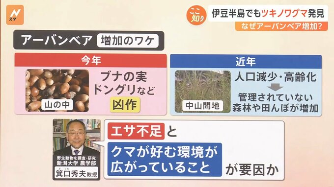箕口教授によると「エサ不足とクマが好む環境が広がっていることが要因ではないか」ということです。