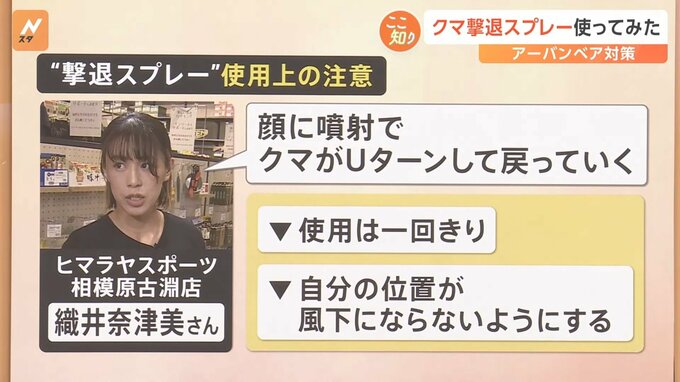 実際に撃退スプレーを販売しているヒマラヤスポーツ相模原古淵店の織井奈津美さんによると「顔に噴射することでクマがUターンして戻っていく。使用は1回きり。自分の位置が風下にならないように気をつけてください」ということです。