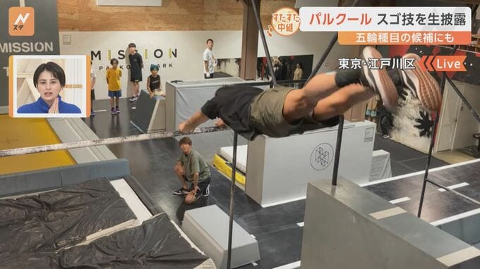 「歩いて発見!すたすた中継」。アクロバティックな動きで人気急上昇のスポーツ「パルクール」。国内最大級のトレーニング施設でスゴ技を見せてもらいました。