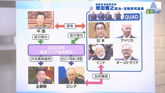 インドについて言うと、クアッド(QUAD)の枠組みの中で、ある意味、我々の価値を共有するフレームワークの中にインドを留めておくっていうことがやっぱり大事だよねと。インドはソ連時代から、ロシアと友好関係にあります。さらにはインドのチャレンジャーっていうのはやっぱり、中国なわけですね。核の問題もありますし、あるいは領土を巡る問題もありますから。そうした中国をにらんだ形でロシアとの安全保障、軍事の関係を強化しているという実態もあります。さらには(ロシアは)エネルギーの供給元であるということ。ロシアを批判するというアクセルを踏みすぎると、クアッドの枠組みが多分崩れていく、インドはここに留まれなくなってくる。インドをいかに我々サイドに残しておくかというところは、決定的に重要であるということ。