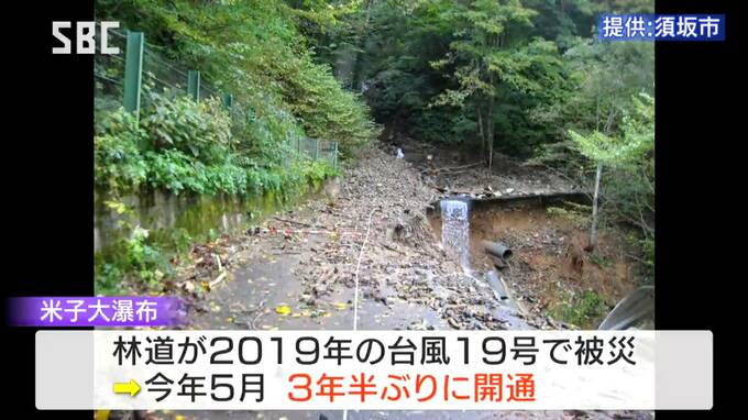 米子大瀑布につながる林道は、2019年の台風19号で被災し、今年5月、3年半ぶりに開通。