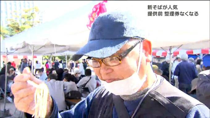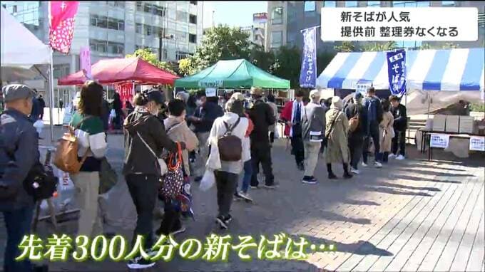 青葉区の勾当台公園で行われている「秋の味覚と新そばまつり」。この催しでは、山形県村山市の自慢の特産品や名産品をPRしています。販売ブースでは、村山で収穫された今が旬のダイコンや柿、食用菊が販売されています。中でも人気だったのが、新そばです。会場では、先着300人に新そばがふるまわれましたが、提供を開始する午前11時前には、すでに整理券はなくなりました。