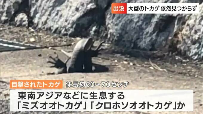 警察によりますと、トカゲは体長60センチから70センチほどで、東南アジアなどに生息する「ミズオオトカゲ」か「クロホソオオトカゲ」と見られています。現場近くの中学校では、朝夕の登下校時に警察がパトロールに出て警戒にあたったほか、現場のすぐそばの広場では、グラウンドゴルフを楽しむ高齢者に注意を呼びかけていました。