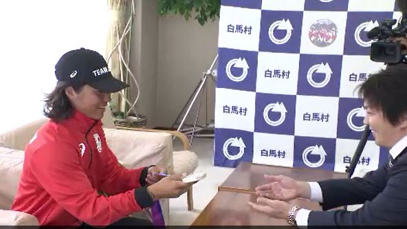 白馬村の丸山俊郎村長を訪れたのは村出身の永原悠路選手です。