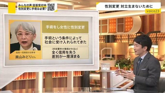 手術を経て戸籍上の性別を男性から女性に変更した美山みどりさんは「手術をしたという条件によって社会に受け入れられてきた。(手術要件が撤廃されると)全く信頼を失ってしまう。差別が一層深まってしまう」と訴えています。