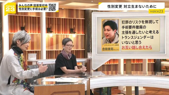 「犯罪のリスクを無視して手術要件撤廃の主張を通したいと考えるトランスジェンダーはいないと思う。お互い話し合えたら」
