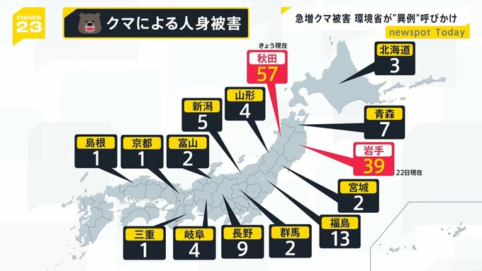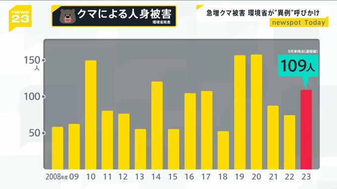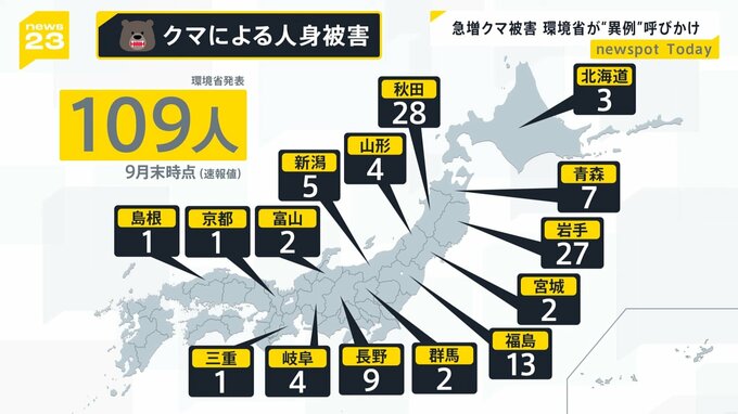 環境省によると、熊に襲われるなどの被害に遭った人の数は先月末の時点で109人。被害は全国各地で相次いでいて、特に多いのが岩手県と秋田県です。被害者の数はこの1か月ほどでさらに増えています。