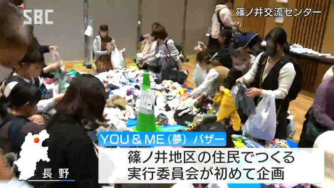 YOU&ME(ゆめ)バザーは長野市篠ノ井地区の住民でつくる実行委員会が初めて企画したもので、会場には回覧板などで呼びかけて集まったおよそ2000点が並びました。