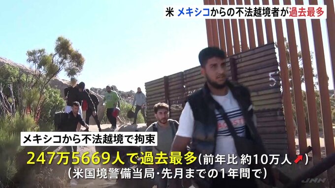 メキシコからアメリカに不法入国し拘束された人が1年間で247万人に上り過去最多を更新しました。国境沿いの町では影響が広がっています。記者「メキシコ側からアメリカ側へと人々が不法越境してきています」アメリ…
