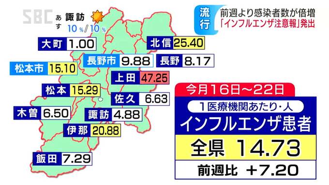 インフルエンザの流行が急速に拡大していることを受け、長野県は25日『インフルエンザ注意報』を出しました。