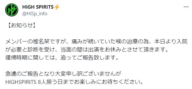 公式Xでは「メンバーの椎名栞ですが、痛みが続いていた喉の治療の為、本日より入院が必要と診断を受け、当面の間は出演をお休みとさせて頂きます。復帰時期に関しては、追ってご報告致します。」と知らせており、「急遽のご報告となり大変申し訳ございませんがHIGHSPIRITS 8人揃う日までお楽しみにお待ちください。」と、謝罪と共に、ファンに呼びかけています。