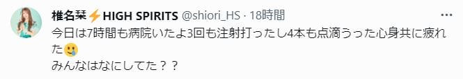 また、椎名さん本人は昨夜のうちに自身のXを更新しており「今日は7時間も病院いたよ3回も注射打ったし4本も点滴うった心身共に疲れた みんなはなにしてた??」と、病院での加療も大変だった様子を伝えています。