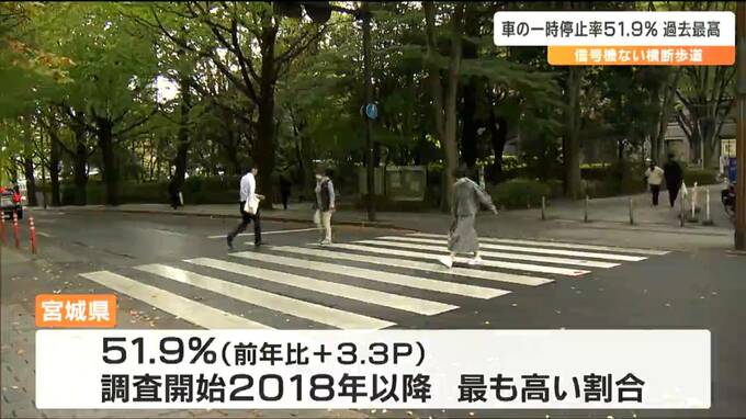 歩行者が信号機のない横断歩道を渡ろうとした際の車の一時停止率について、宮城は51.9パーセントと過去最高となりました。