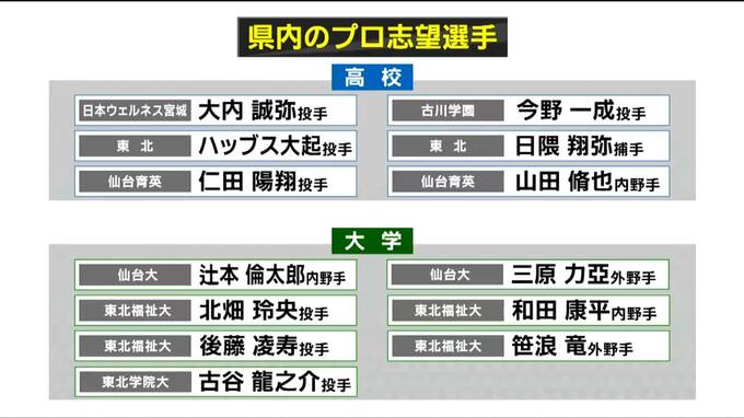また、宮城県内では仙台大の内野手・辻本倫太郎選手など13人がプロ志望届を提出しています。