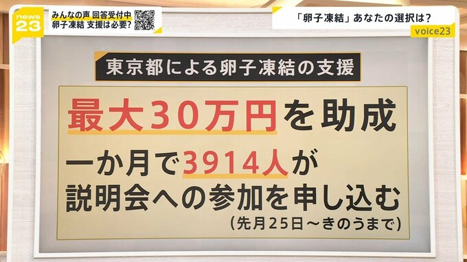 卵子凍結をする際、最大30万円の費用を助成するという東京都。この支援を受けるには、都の説明会に参加することなどが条件ですが、申し込み人数が受け付け開始から、1か月で3914人に上っているそうなんです。(9月25日~10月24日まで)かなり関心は高いようで、東京都は説明会の回数を増やして対応をしているということです。