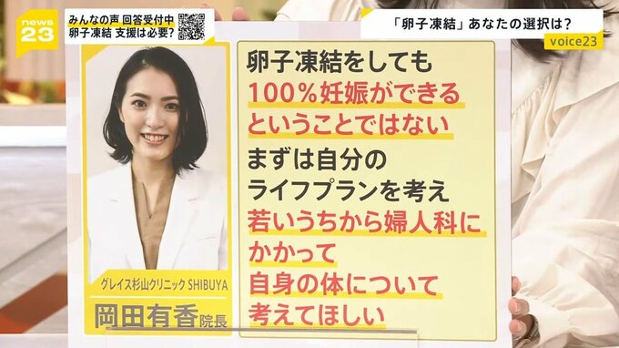 グレイス杉山クリニックSHIBUYA 岡田有香院長は「卵子凍結をしても100%妊娠ができるということではない。まずは自分のライフプランを考え、若いうちから婦人科にかかって、自身の体について考えてほしい」と話しています。