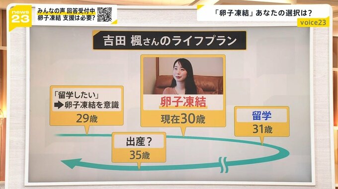 なぜ卵子凍結をするのか?お話を聞いた吉田楓さんは現在30歳ですが、29歳の時に留学したいと思い、卵子凍結について考え始めます。そして30歳で卵子凍結を行い、2024年、31歳で海外に留学する予定。その後、35歳くらいで一人目を出産できたらいいなと、ライフプランを考えているそうです。