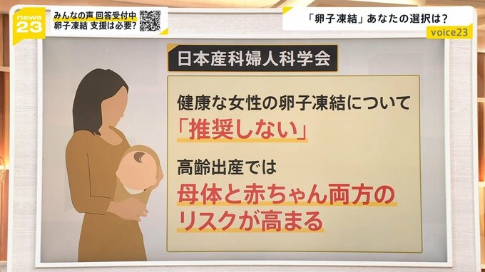 卵子凍結は、例えばがんの患者さんが治療の前に行うなど、医学的に必要な場合にも行われています。日本産科婦人科学会は、そうではない健康な女性の卵子凍結について「推奨しない」としています。その理由として「高齢出産では母体と赤ちゃん両方のリスクが高まる」ことなどを挙げています。